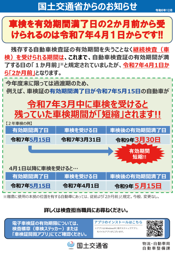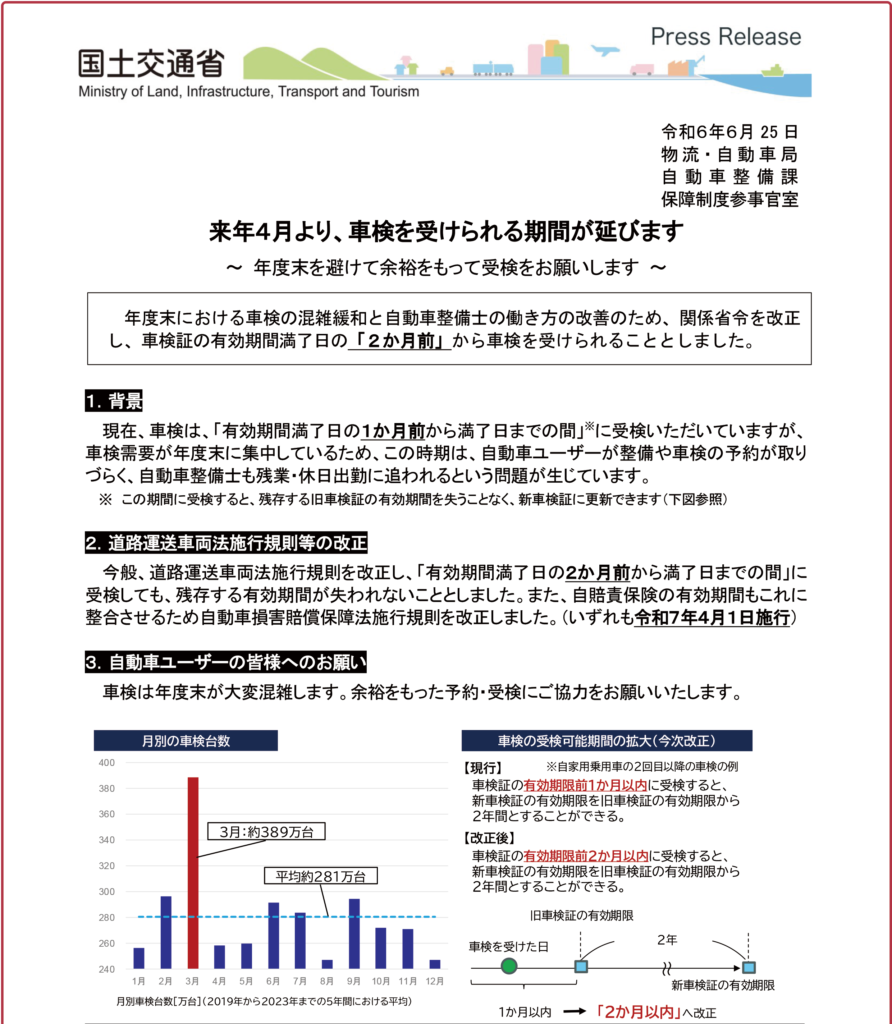 国土交通省より案内もあります通り令和7年4月1日から車検を有効期間の2か月前から受けることが出来るようになります。